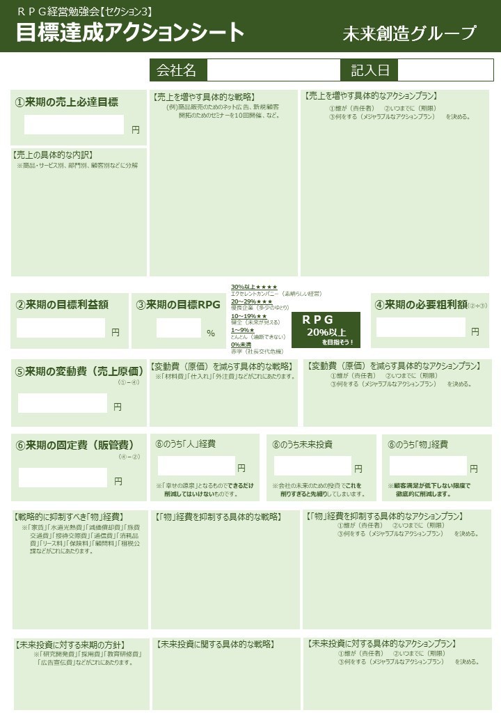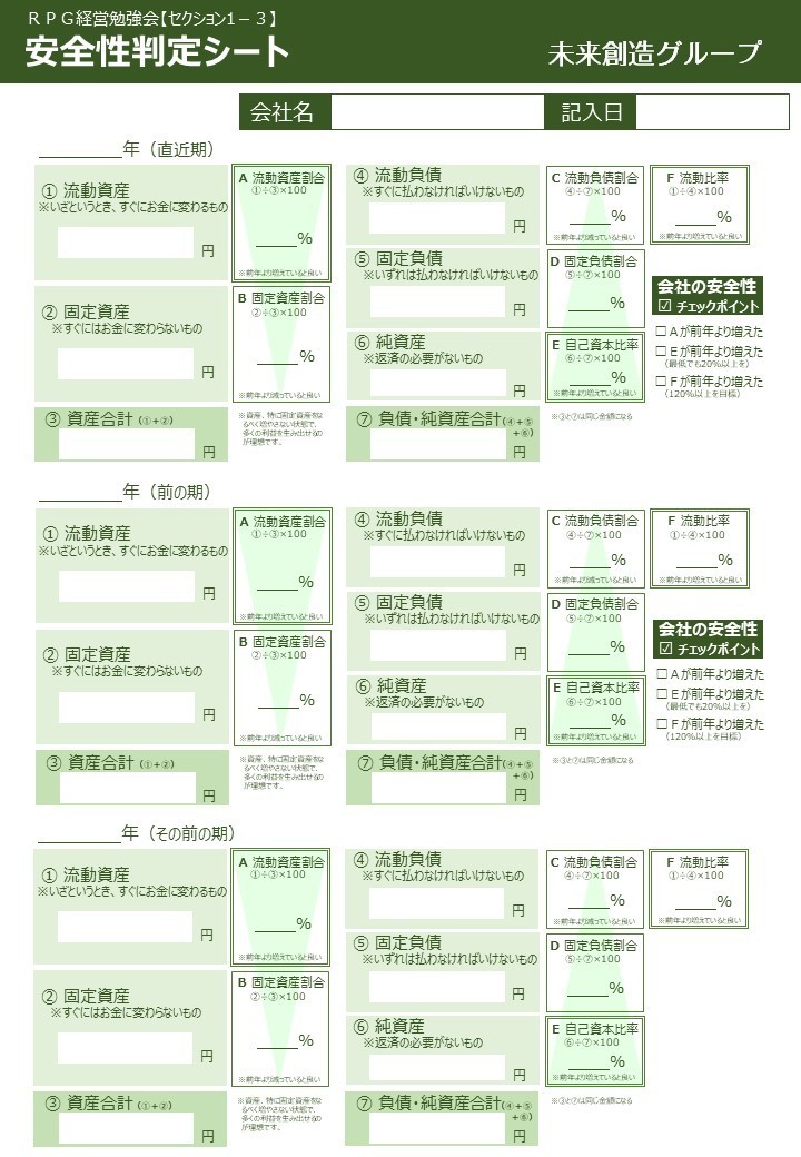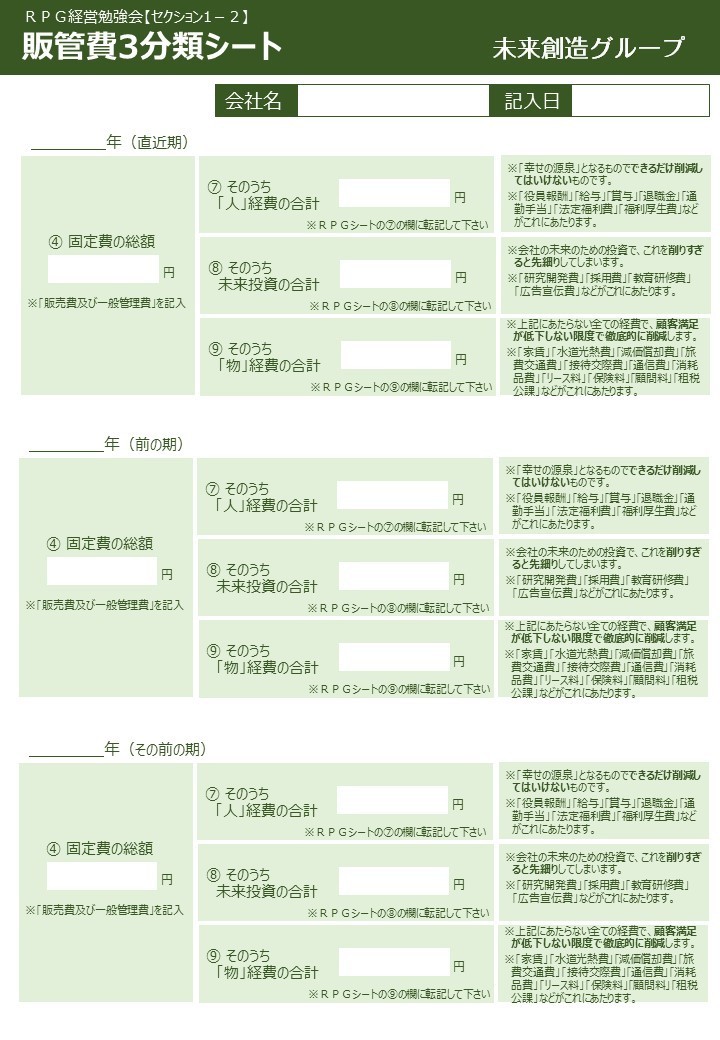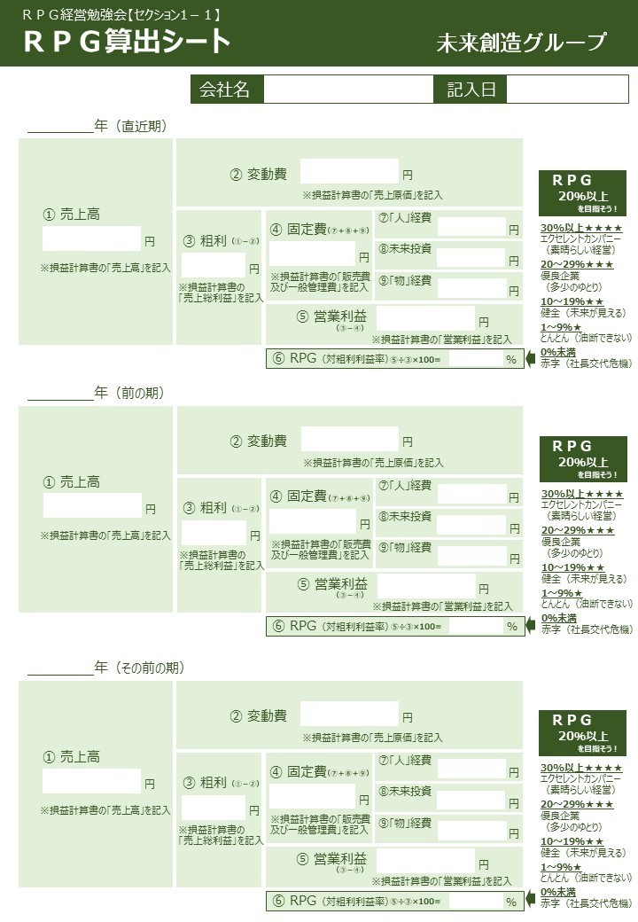3期分の損益計算書を元に、会社のRPGを計算することができます。3年分のRPGを比較することで、会社の経営が上向いているか、下降しているかも確認することができます。(本文156ページ)※サムネイルをクリックするとダウンロードできます。
