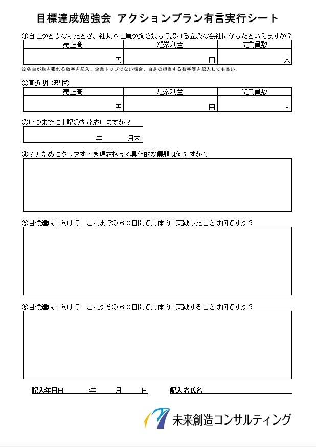 常に、目指すべき理想像と現在地のギャップを確認し、ゴールに近づくためにやるべきことを宣言します。また、宣言したことを実行したかをチェックすることも大切です。社内に社長の行動をチェックする人はいませんので、目標達成勉強会では有言実行シートを使って2ヶ月に1回、宣言通り実践できているかをチェックし、PDCAサイクルを回します。(本文179ページ)